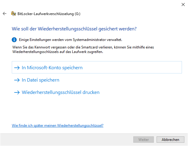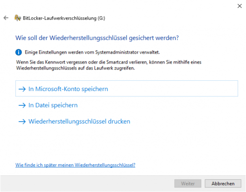 Für den gar nicht zu seltenen Fall, dass der Anwender sein Passwort doch vergisst, kann ein 48-stelliger Wiederherstellungsschlüssel gespeichert oder ausgedruckt werden. Neben der Speicherung als Datei kann der Schlüssel auch im Microsoft-Konto abgelegt werden. Der Schlüssel steht dann aber auch nur zur Verfügung, wenn man sich mit dem entsprechenden Microsoft-Konto anmeldet. Wir empfehlen daher die Speicherung in eine Datei an einem sicheren Ort, beispielsweise auf einer CD, oder einen sicheren Ausdruck.