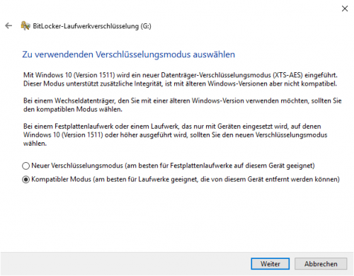 Im nächsten Schritt können Sie den Verschlüsselungsmodus wählen. Wir raten zum kompatiblen Modus (AES-CBC), damit diese Medien auch unter Windows 7 oder Windows 8.1 sowie mit älteren Editionen von Windows 10 noch lesbar sind.