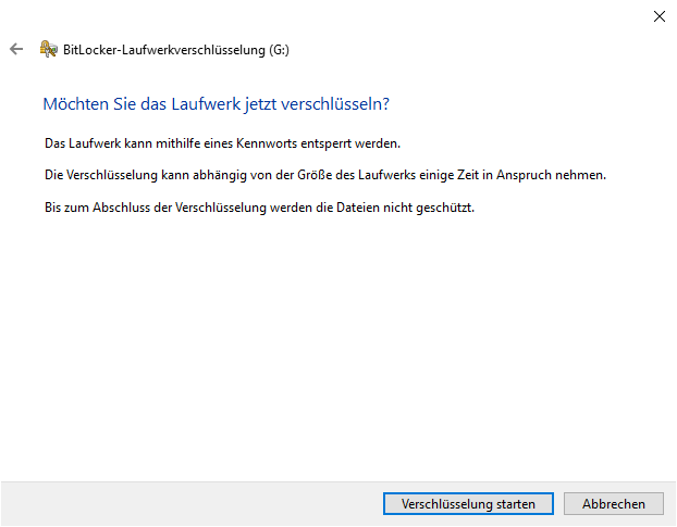 Bevor nun die Verschlüsselung des Sticks oder der externen Festplatte gestartet wird, erfolgt nochmals eine Abfrage, ob Sie das Laufwerk jetzt verschlüsseln möchten.