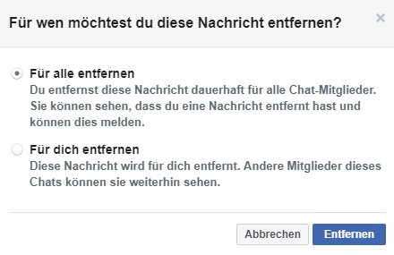 Anfang des Jahres wurde Facebook (analog zu WhatsApp) mit einer Funktion nachgerüstet, mit Hilfe derer Sie bereits verschickte Nachrichten nachträglich (auch beim anderen Nutzer) noch löschen können. Diese steht sowohl für einzelne Nachrichten als auch für Gruppenchats zur Verfügung.