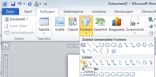 Als ersten Schritt müssen Sie eine Linie zeichnen, welche die Falzmarke darstellt. Wechseln Sie dazu in die Registerkarte „Einfügen“. Klicken Sie auf „Formen“ und wählen Sie hier „Linie“ aus. Zeichnen Sie eine kurze, vertikale Linie auf das Blatt.