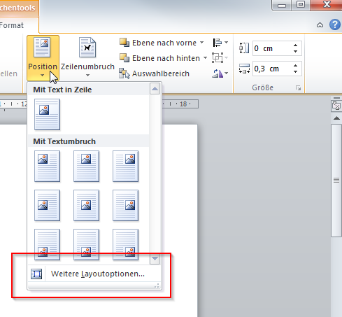 Wechseln Sie dann im Reiter „Zeichentools“ auf „Position“ und dort auf „weitere Layoutoptionen“.
