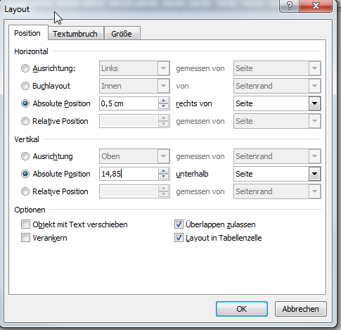 Tragen Sie für die horizontale Ausrichtung eine absolute Position von 0,5 cm rechts vom Seitenrand und für die horizontale Ausrichtung eine absolute Position von 8,7 cm (Form A) bzw. 10,5 cm (Form B) unterhalb der Seite für die erste Falzmarke ein.