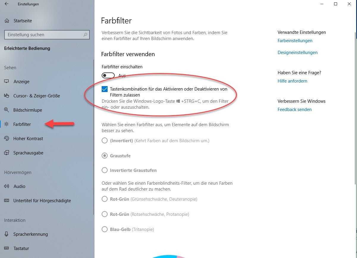 Der Farbfilter kann mit der Windows-Tastenkombination WIN+STRG+C aktiviert werden. Dazu muss aber seit Windows 10 Version 1803 (April-Update) die Funktion der Tastenkombination erst in den Einstellungen unter Erleichterte Bedienung -> Farbfilter unter „Tastenkombination für das Aktivieren oder Deaktivieren von Filtern zulassen“ aktiviert und der Standard-Farbfilter festgelegt werden.