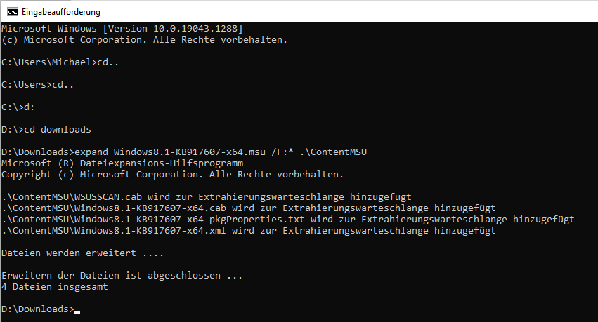 md ContentMSU expand Windows8.1-KB917607-x64.msu /F:* .\ContentMSU cd ContentMSU md ContentCAB expand Windows8.1-KB917607-x64.cab /F:* .\ContentCAB cd ContentCAB dir amd64*de-*. cd amd64_microsoft-windows-winhstb.resources_31bf3856ad364e35_6.3.9600.20470_de-de_1ab8cd412c1028d0 takeown /f “%SystemRoot%\en-us\winhlp32.exe.mui” icacls “%SystemRoot%\en-us\winhlp32.exe.mui” /grant “%UserName%”:F ren %SystemRoot%\de-de\winhlp32.exe.mui winhlp32.exe.mui.w10 copy winhlp32.exe.mui %SystemRoot%\de-us\winhlp32.exe.mui takeown /f “%SystemRoot%\winhlp32.exe” icacls “%SystemRoot%\winhlp32.exe” /grant “%UserName%”:F ren %SystemRoot%\winhlp32.exe winhlp32.exe.w10 cd .. dir *.exe /s cd “amd64_microsoft-windows-winhstb_31bf3856ad364e35_6.3.9600.20470_none_1a54d9f2f676f6c2” copy winhlp32.exe %SystemRoot%\winhlp32.exe