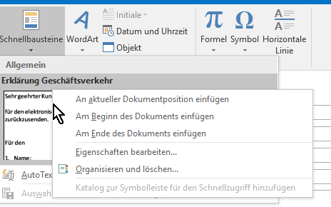 Wenn Sie einen Schnellbaustein editieren oder löschen möchten, klicken Sie mit der rechten Maustaste über einen Schnellbaustein und wählen „Organisieren und löschen“ aus.
