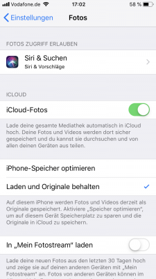 iPhone-Speicher optimieren: Einsteiger-iPhones haben oft nur 32 GB oder sogar weniger Speicher. Da kann es schnell vorkommen, dass der Speicher vom iPhone voll ist. Die Sicherung der Fotos in die iCloud bietet auch die Möglichkeit, den iPhone-Speicher zu optimieren. Damit werden bei Speichermangel die Bilder in der Originalauflösung in der iCloud gesichert, während eine qualitativ geringere Vorschau auf dem Smartphone verbleibt. Sobald Sie auf das Bild dann zugreifen, lädt das iPhone das Bild aus der Cloud wieder herunter.