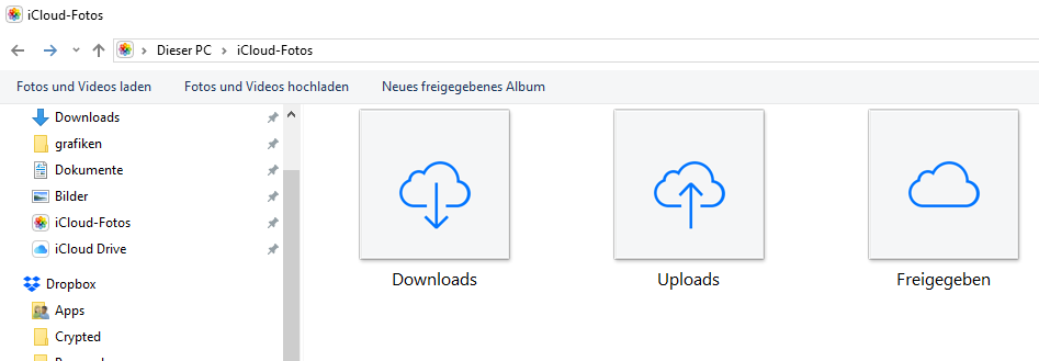 iCloud-Fotos bindet sich auch in die Favoriten vom Windows Explorer ein. Ihre Fotos und Videos finden Sie dann in den „Downloads“ oder unter „Freigegeben“.