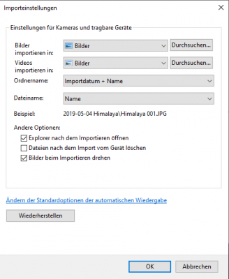 Hinter dem Textlink „Weitere Optionen“ können Sie die Importeinstellungen festlegen. Zur Auswahl stehen die Zielordner für Fotos und Videos und das Schema der Ordner- und Dateinamen. Wenn Sie beispielsweise regelmäßig eine Sicherung aller Bilder machen, können Sie als Ordnername das Importdatum festlegen.