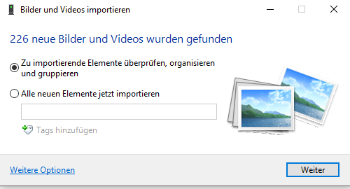 Wenn Sie sich für den Import von Fotos und Videos entscheiden, startet Windows 10 den Import-Assistenten. Hier können Sie alle oder nur neue Elemente importieren.