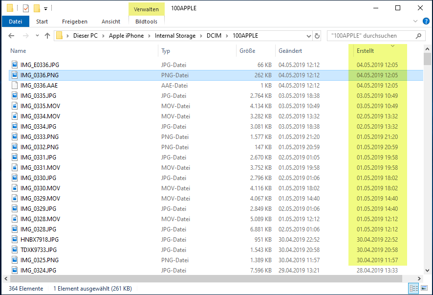 Über das Erstellungsdatum der Ordner können Sie dabei nicht erkennen, von wann die einzelnen Aufnahmen sind. Um das Aufnahmedatum angezeigt zu bekommen, müssen Sie im Windows Explorer mit der rechten Maustaste auf die Liste bei „Typ/Größe/Geändert“ klicken und sich auch das Erstellungsdatum anzeigen lassen. Nun sehen Sie eine neue Spalte „Erstellt“. Wenn Sie die Fotos nach diesem Datum sortieren lassen, dazu einfach auf die Spalte klicken, sehen Sie die neuste Aufnahme automatisch ganz oben.