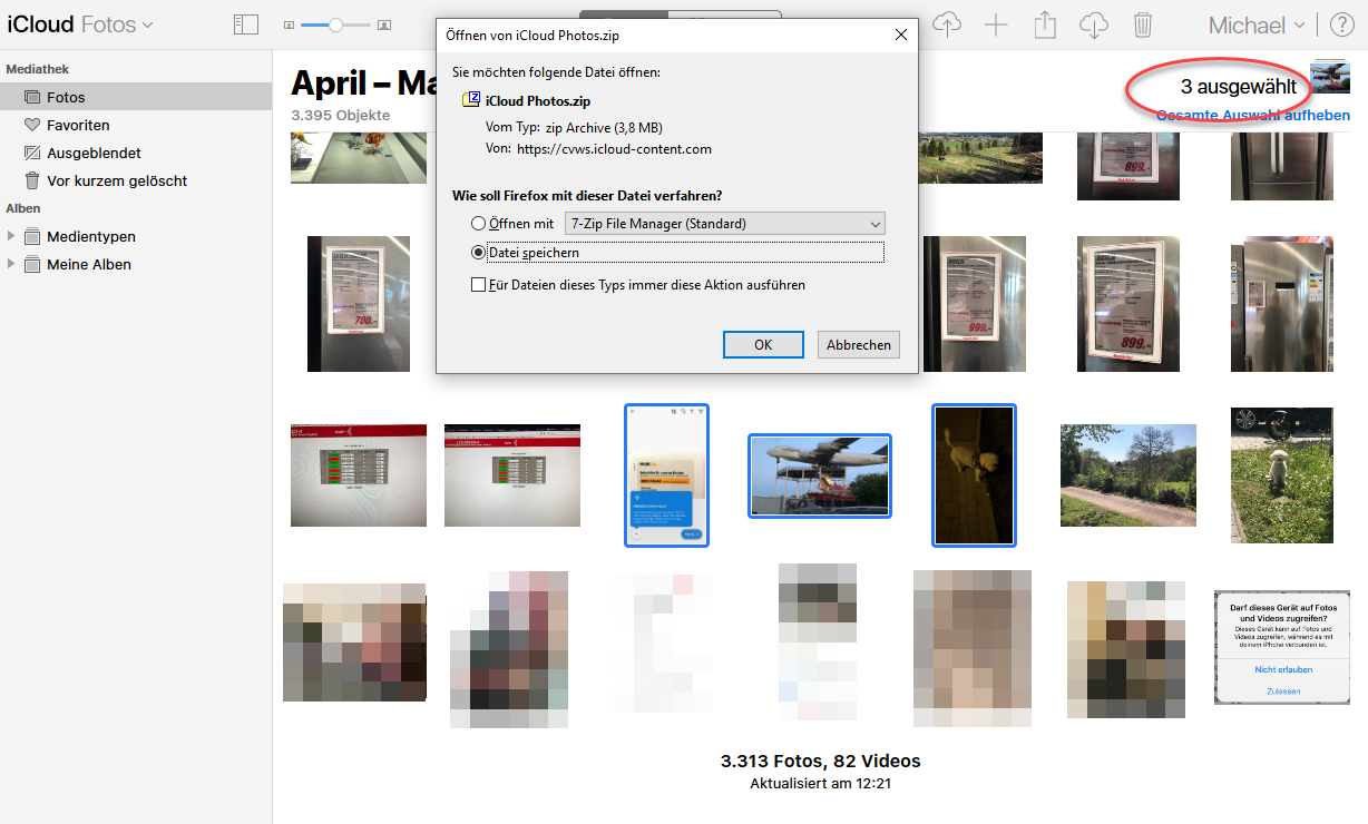 Wenn Sie mehrere Bilder markieren, müssen Sie diese nicht einzeln abspeichern. In diesem Fall fasst die Webseite von iCloud die Fotos zu einer Archivdatei im ZIP-Format zusammen, welche Sie mit Windows oder Packprogrammen wie beispielsweise 7-Zip oder Winzip bzw. WinRAR entpacken können.