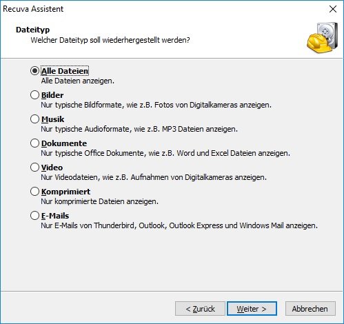 - Klicken Sie auf „Weiter“ und legen Sie im nächsten Schritt fest, welche Art von Dateien Sie wiederherstellen möchten.