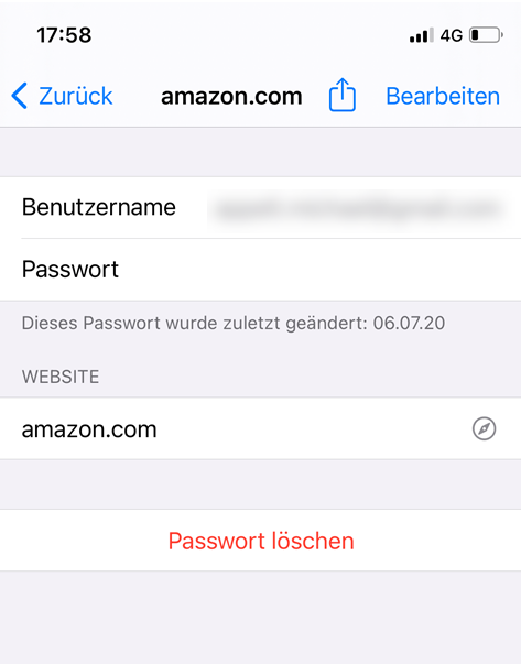 Das iPhone und auch iPad listen hier alle gespeicherten Passwörter. Sie können einzelne Passwörter unter iOS löschen, indem Sie auf den Eintrag drücken und dann „Passwort löschen“ auswählen.