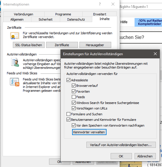 Der alte Internet Explorer spielt keine große Rolle mehr, kann aber auch Passwörter speichern. Um diese zu verwalten oder zu löschen, wechseln Sie in die Internetoptionen über den Internet Explorer oder die klassische Systemsteuerung. Auf der Registerkarte „Inhalte“ findet sich der Button „Kennwörter verwalten“. Sie können hier jedes der gespeicherten Kennwörter gezielt löschen.