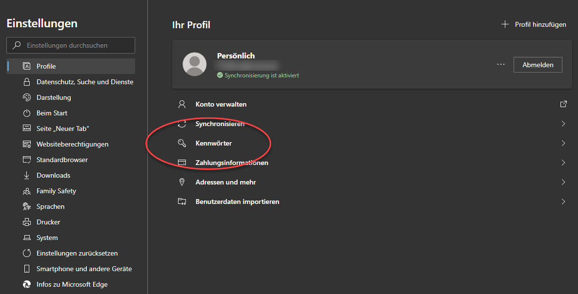 Der Browser Microsoft Edge in Windows 10 und Edge Chromium speichern auch Kennwörter im Profil des Anwenders. Sie können hier gespeicherte Kennwörter löschen, indem Sie in die Browsereinstellungen wechseln. Im Eintrag „Profile“ finden Sie die Unteroption „Kennwörter“.