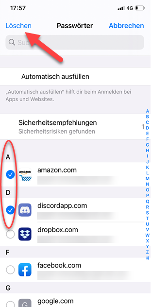 iOS bietet Ihnen in der Listenansicht aller Passwörter auch die Möglichkeit, gleich mehrere Einträge zu löschen. Drücken Sie dazu auf „Bearbeiten“ oben rechts und selektieren Sie dann die Passwörter, welche Sie entfernen möchten. Oben links finden Sie dann „Löschen“ für alle markierten Einträge.