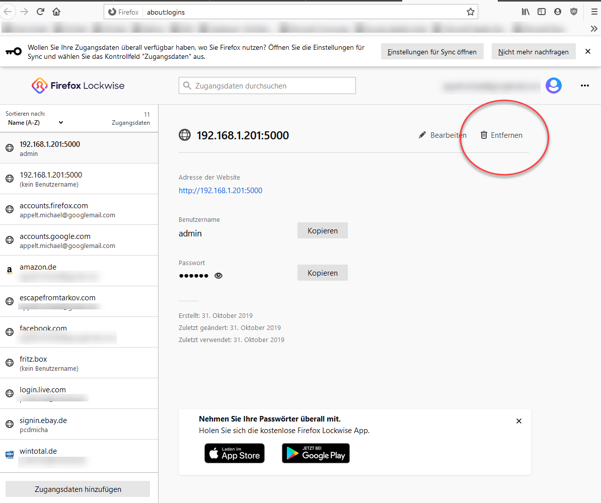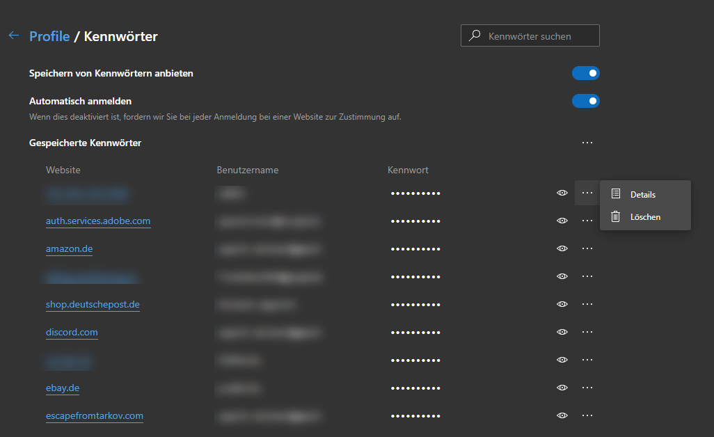 Wenn Sie auf den Eintrag „Passwörter“ klicken, öffnet sich eine Übersicht mit allen gespeicherten Zugangsdaten. Wenn Sie einen Eintrag löschen möchten, müssen Sie auf die drei Punkte rechts vom Eintrag klicken und bekommen dann im Kontextmenü „Entfernen“ angezeigt.
