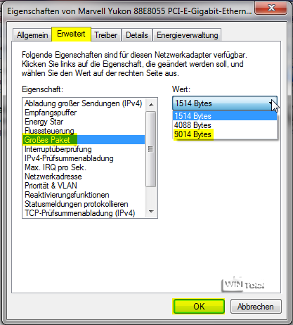 Markieren Sie „Jumbo Packet„, „Großrahmen„, „Großes Paket“ oder „Große MTU“ (je nach Netzwerkkarte) und stellen Sie unter Wert „9 KB MTU“ bzw. „9014 Bytes“ ein.