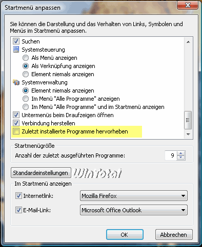 – Unter Windows Vista kommt man zur Option Zuletzt installierte Programme hervorheben über die Taskleiste (Eigenschaften) – Registerkarte „Startmenü“ – Button „Anpassen“ – und ganz runterscrollen.