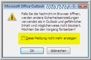 Falls Sie die Nachricht im Browser öffnen, werden andere Sicherheitseinstellungen verwendet als in Outlook und gefährlicher Inhalt wird möglicherweise nicht blockiert. Möchten Sie den Vorgang fortsetzen?