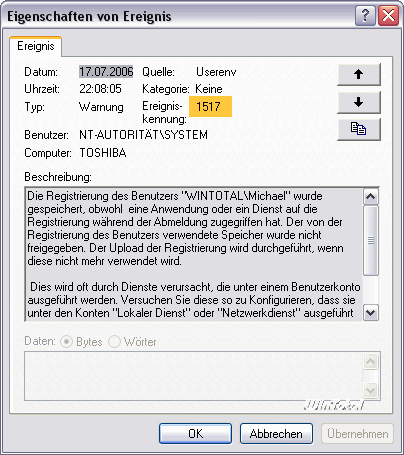 Die Fehler mit der Event-ID 1517 und 1524 entstehen häufig durch Programme, welche Registry-Teile beim Abmelden des Benutzers als noch geöffnet markiert haben.