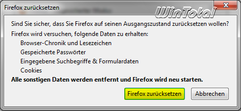 Firefox versucht, folgende Daten zur erhalten: Browser-Chronik, Lesezeichen, gespeicherte Passwörter, eingegebene Suchbegriffe, eingegebene Formulardaten und Cookies.