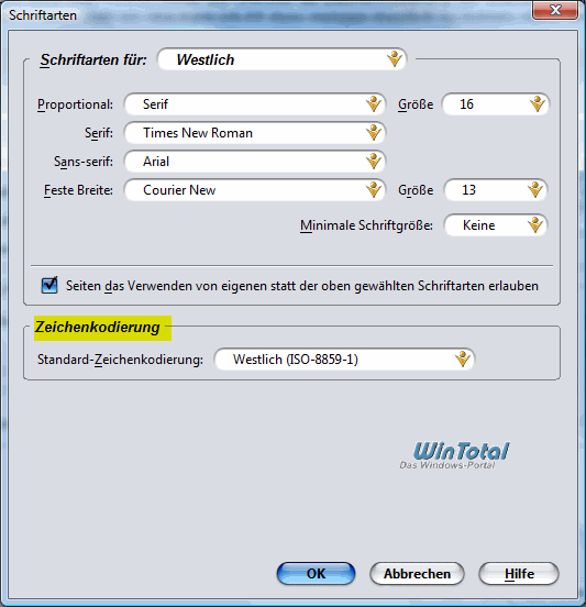 Zeichenkodierung „Standard“ unter Extras – Einstellungen – „Inhalte“ – »Schriftarten & Farben« – Button „Erweitert“.