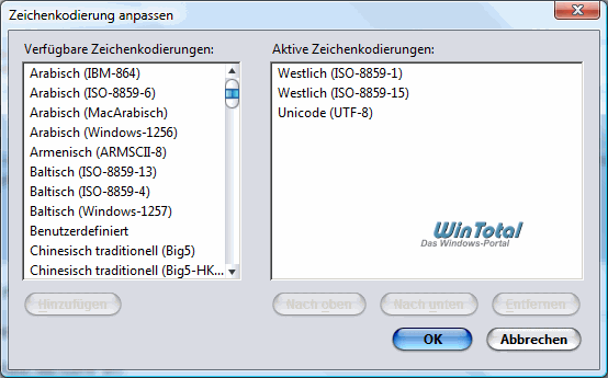 Die entfernten Zeichenkodierungen gehen dabei nicht verloren, da sie unter „Verfügbare Zeichenkodierungen“ wieder hinzugefügt werden können.