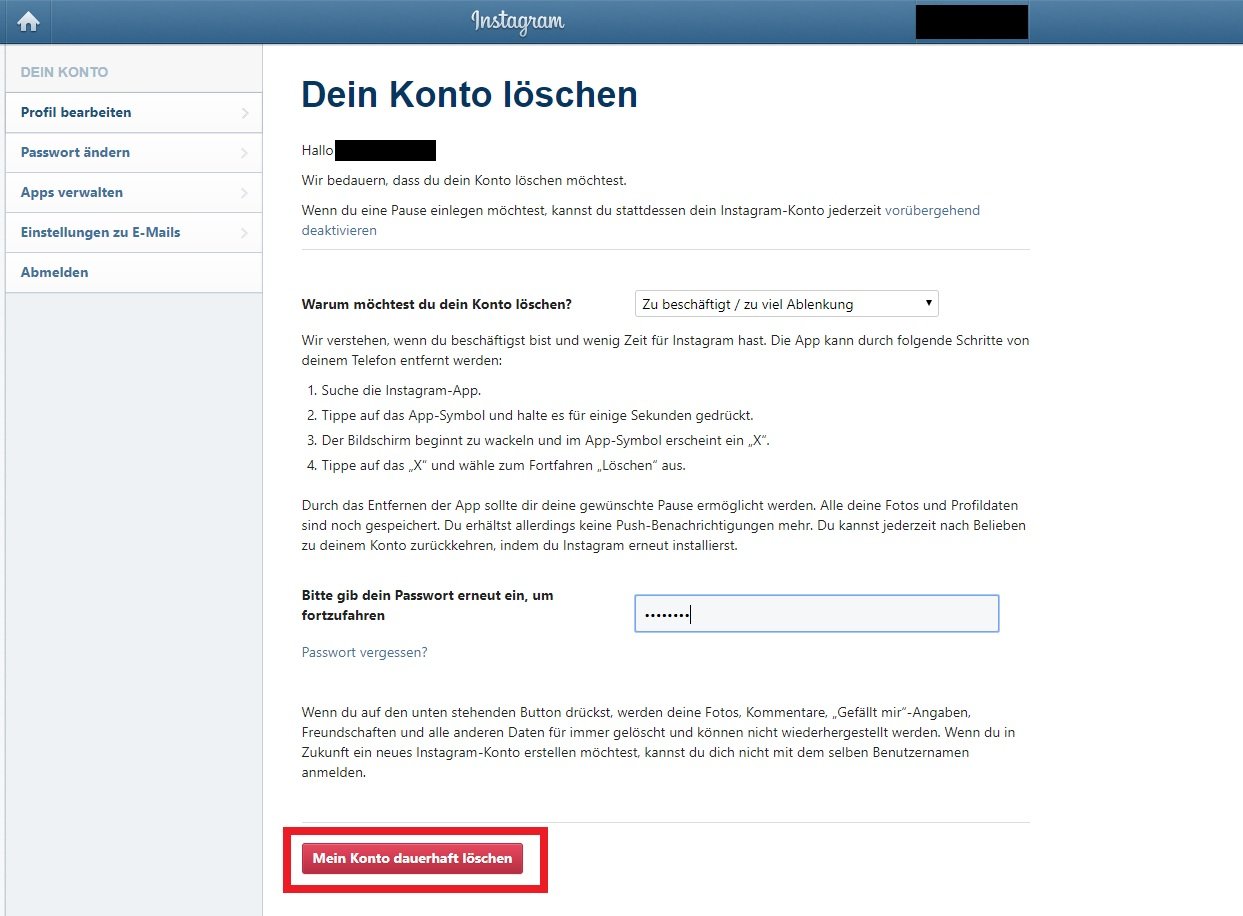 - Mit einem Klick auf den roten Button „Mein Konto dauerhaft löschen“ wird Ihr Account endgültig geschlossen.