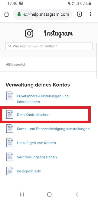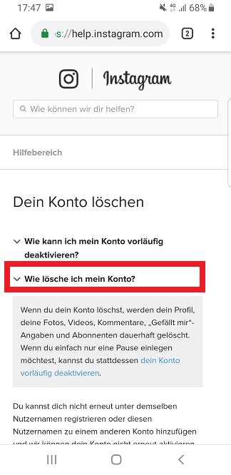 - Sie haben nun die Wahl zwischen mehreren Optionen. Klicken Sie auf „Wie lösche ich mein Konto“ und folgen Sie den Anweisungen in den Punkten 1 bis 3. Der Vorgang lässt sich ohne Passwort-Eingabe durchführen, da Sie über die App auf die Seite geleitet wurden.