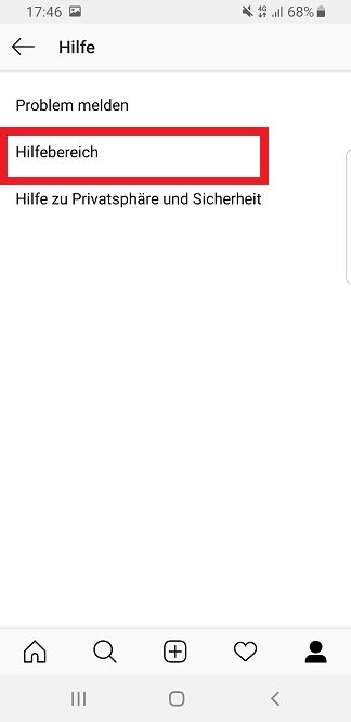 - Scrollen Sie nach unten zum Eintrag „Hilfe“ und wählen Sie den Unterpunkt „Hilfebereich“ aus. Sie werden nun automatisch auf die Instagram-Webseite weitergeleitet.