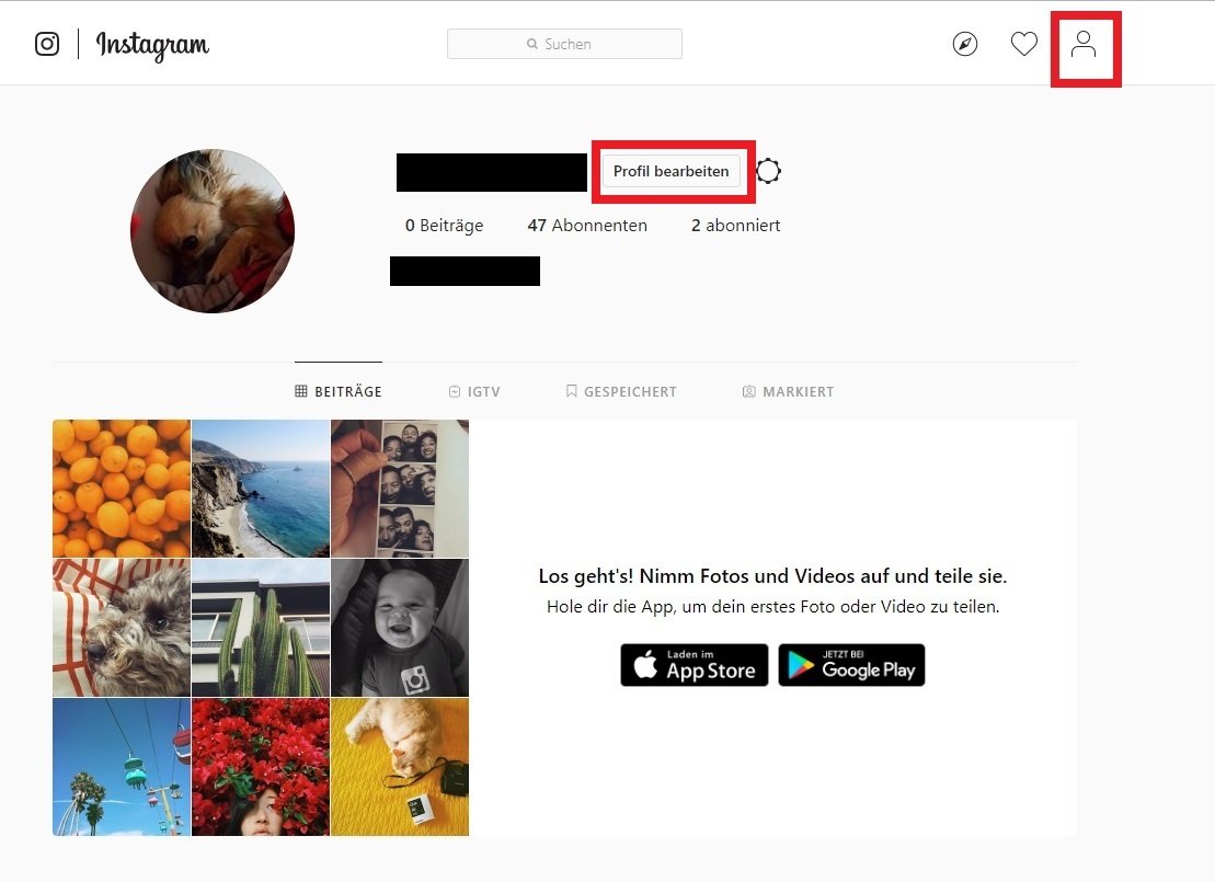 - Klicken Sie rechts oben auf „Profil“ (das Männchen-Symbol) und anschließend neben Ihrem Benutzernamen auf den Button „Profil bearbeiten“.