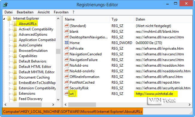 eine neue Zeichenfolge (REG_SZ) mit wt anlegen. Als Wert die komplette URL, wie hier im Beispiel https://www.wintotal.de