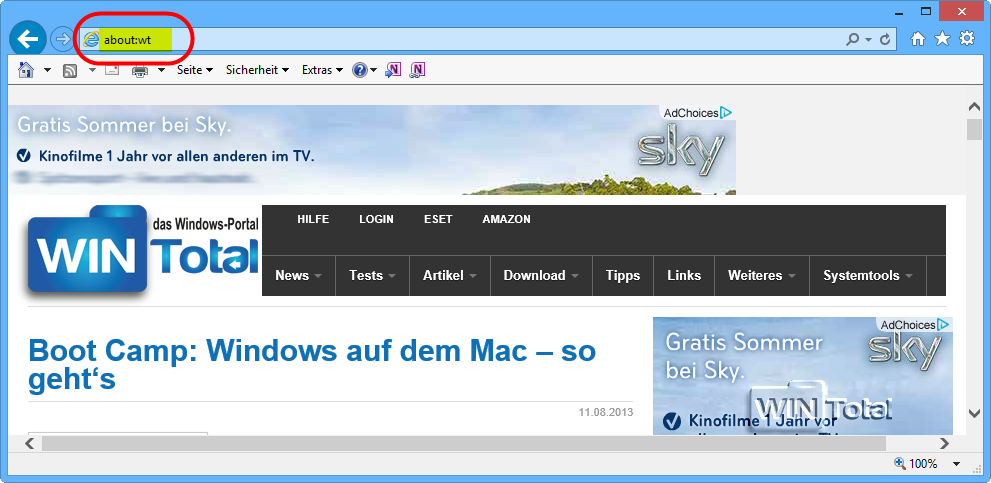 Bei sehr langen Adressen ist es vorteilhaft, nur eine Kurzform in die Adressleiste zu tippen. Anstelle von https://www.wintotal.de geben Sie dann nur noch about:wt (about Doppelpunkt Wunschbuchstaben) in die Adresszeile des Internet Explorers ein.