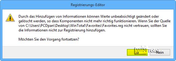 Danach klicken Sie doppelt auf Ihre Favorites.reg und klicken auf „Ja„.