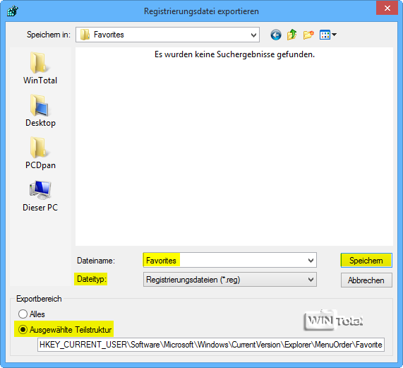 Geben Sie nur noch einen Dateinamen an, z.B. „Favorites„, der Dateityp steht schon auf (*.reg) und unter „Exportbereich“ ist die Option „Ausgewählte Teilstruktur“ schon aktiviert. Speichern Sie die Favorites.reg am besten in dem Ordner, in dem auch schon die Datei bookmark.htm liegt.