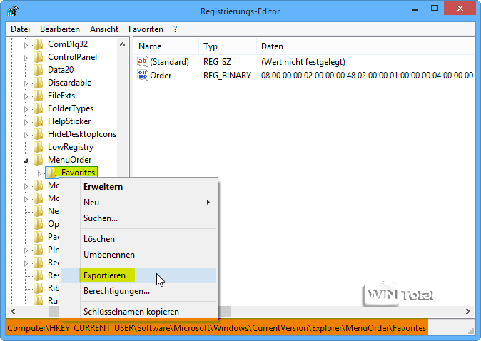 klicken Sie auf den Unterschlüssel Favorites, sodass er markiert ist. Dann klicken Sie mit der rechten Maustaste auf den markierten Unterschlüssel Favorites und wählen „Exportieren“ aus.