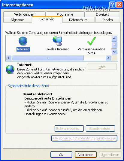 In den Internetoptionen – Register „Sicherheit“ sind die Schaltflächen „Stufe anpassen„, „Standardstufe“, „Alle Zonen auf Standardstufe zurücksetzen“ oder der Schrieberegler deaktiviert.