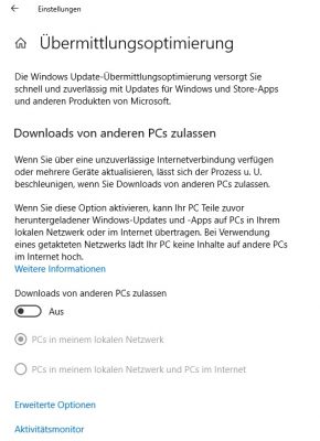 Das Betriebssystem Windows 10 benutzt einen „Peer-to-Peer“-Upload-Dienst, um Updates über Ihren Computer schneller an andere Nutzer im selben Netzwerk weiterzugeben. Dies erfordert sehr viel Arbeitsleistung und hat damit auch Auswirkung auf das Internet. In den Einstellungen unter „Update & Sicherheit“ unter den erweiterten Optionen lässt sich dies nach einem Klick auf „Übermittlungsoptimierung“ ausschalten.