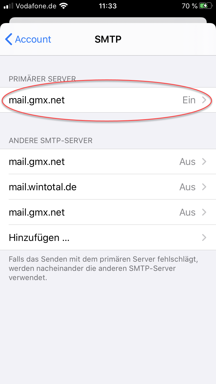 Die Einstellungen für ausgehende Mails finden sich hinter dem Eintrag „SMTP“. Dort werden alle auf dem Gerät eingerichtete SMTP-Server anzeigt. Als primärer Server wird der mit dem Mailaccount verbundene Server angezeigt.