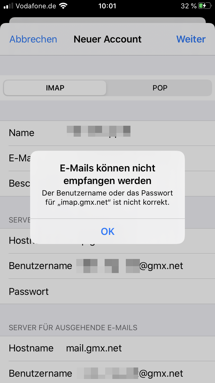 3.2. Der Benutzername oder das Passwort bei GMX ist nicht korrekt