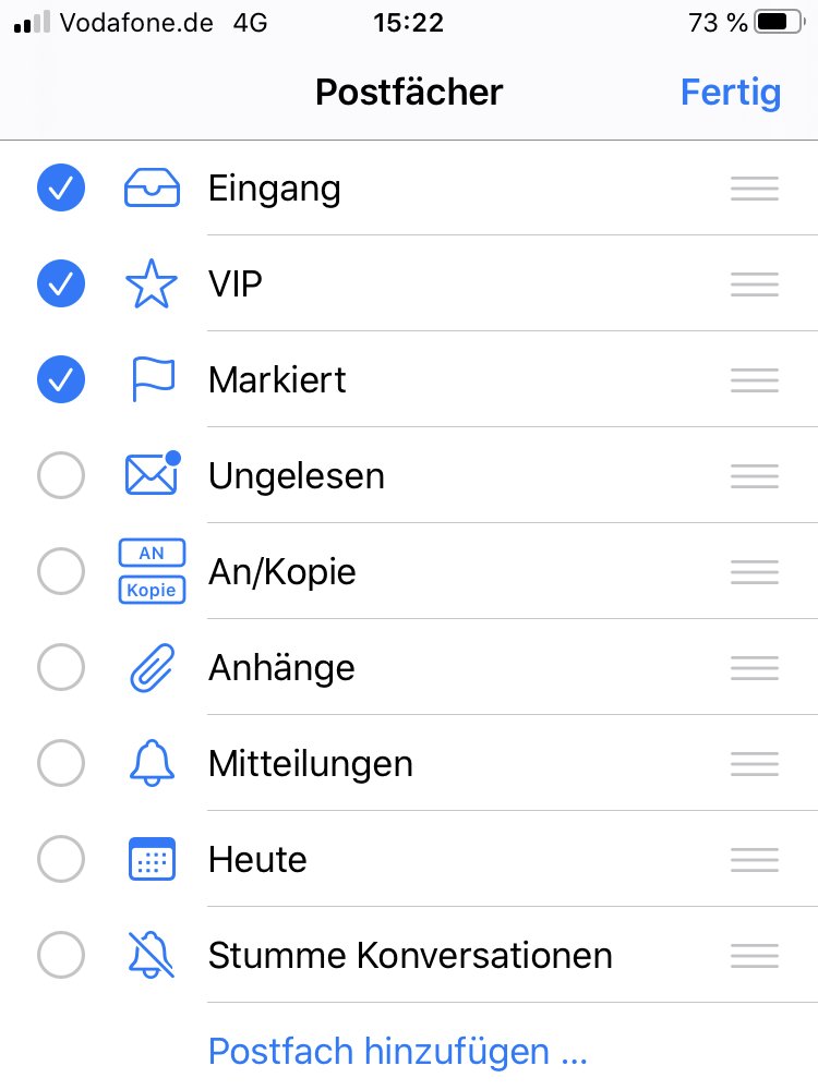 Über die „Bearbeiten“-Funktion oben rechts in der Mail-App können Sie auswählen, welche Ordner Sie „abonnieren“ wollen, auf Ihrem iPhone angezeigt werden. Über die drei Linien am rechten Rand können Sie die Einträge auch beliebig anordnen.