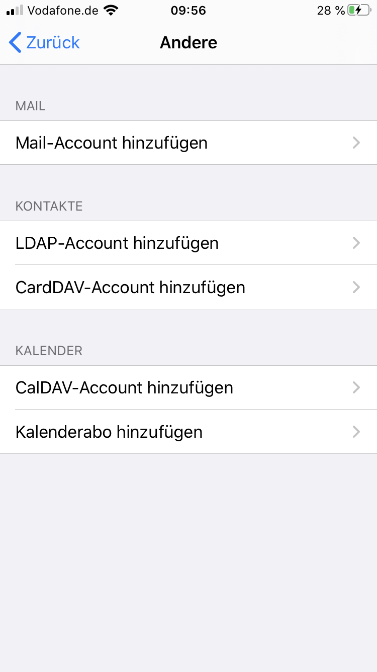 Gut zu wissen: Neben anderen Mail-Accounts können Sie auch Accounts für Kontakte (LDAP oder CardDAV) sowie Kalender über CalDAV und Kalenderabos als ICS-Datei mit dem iPhone verbinden.