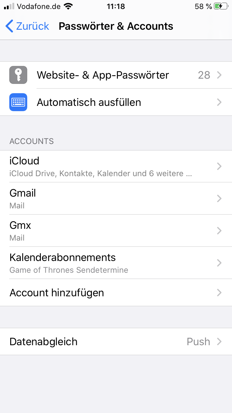 Die Einrichtung eines Mail-Accounts auf dem iPhone findet nicht in der App, sondern in den Einstellungen statt. Wechseln Sie hier in den Abschnitt Accounts & Passwörter. Hier werden alle mit dem iPhone verbundenen Accounts wie iCloud, Mailaccounts oder abonnierte Kalender aufgelistet.
