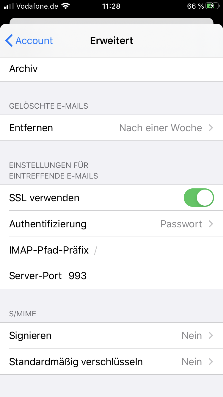 Hier bietet das iPhone dann auch den Eintrag „Erweitert“, hinter dem Sie für den Posteingangsserver, den Posteingangsserver, die Art der Verschlüsselung, Authentifizierung und Server-Ports angeben können, wenn dieser von den Standard-Ports (993 für IMAP über SSL bzw. 587 für SMTP oder 465 für SMTP über SSL) abweichen.
