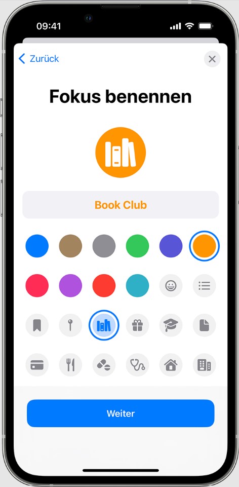 - Wählen Sie eine Farbe und ein Symbol aus und tippen Sie auf „Weiter“.