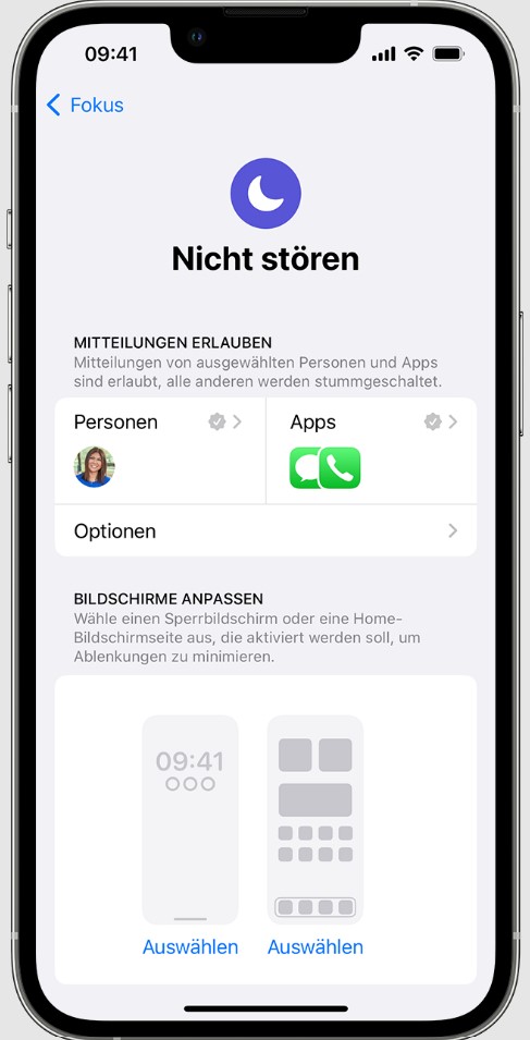 Darüber hinaus gibt es weitere Vorschläge wie „Achtsamkeit“, „Auto fahren“, „Lesen“ oder „Spielen“, die Sie nach Ihren persönlichen Vorlieben konfigurieren können. Seit iOS 16 besteht außerdem die Möglichkeit, unterschiedliche Sperrbildschirme (z. B. für Privates oder Berufliches) zu definieren. Der Fokus lässt sich außerdem so anpassen, dass er zu bestimmten Zeiten bzw. an bestimmten Standorten automatisch ausgelöst wird.
