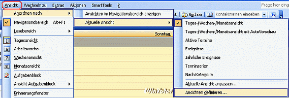 Outlook-Kalender öffnen – Menü „Ansicht“ – anordnen nach – Aktuelle Ansicht – Ansicht definieren.