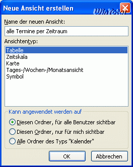 Button „Neu“ – unter „Name der neuen Ansicht“ einen Namen vergeben, Beispiel: „Alle Termine per Zeitraum“ und unter „Ansichtentyp“ den Eintrag Tabelle markieren.